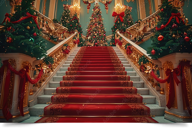 🎄 Вініловий фотофон “Christmas Staircase” — немов кадр із святкового фільму. Розкішні сходи, застелені червоним оксамитовим килимом із золотистими деталями, зелені стіни, ялинки з обох боків і великі червоні банти на перилах — усе це створює чарівну атмосферу свята.